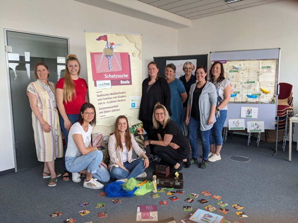 Am 2. Mai 2024 erhielten nach sechs Weiterbildungstagen in der SLfG-Geschäftsstelle 11 neue Schatzsuche-Referentinnen aus 8 Einrichtungen ihr Zertifikat, das sie zur Durchführung von Eltern-Treffen in ihren Einrichtungen qualifiziert.