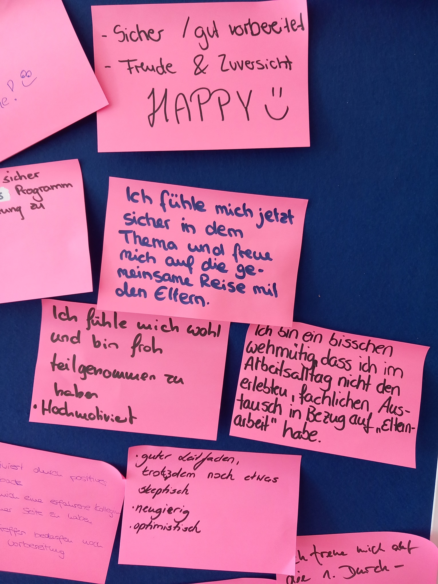 Einige Rückmeldungen zur Frage „Wie geht es mir als Schatzsuche-Referentin?“ können Sie dem folgenden Foto entnehmen. „Jede (von uns) ist ein großer Gewinn für die Einrichtung und die Zusammenarbeit mit Eltern“, so die wertschätzende Aussage einer Teilnehmerin am Ende der Qualifizierung.