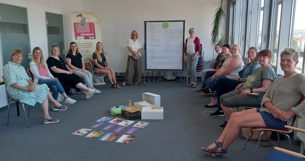 9 sächsische Schatzsuche-Referentinnen kamen am 19. Juni in der Geschäftsstelle der SLfG zusammen. Einige führen bereits seit mehreren Jahren Eltern-Treffen durch, andere stehen noch am Anfang der Umsetzung. Neben den wertvollen Tipps und Erfahrungen und dem wertschätzenden Austausch der Kolleginnen aus den Kitas konnten viele Fragen direkt mit Maria Gies, Programmleitung Schatzsuche in Hamburg, aufgegriffen und diskutiert werden.