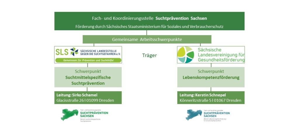 Der Bereich Lebenskompetenzförderung wird von dem Träger der Sächsischen Landesvereinigung für Gesundheitsförderung e. V. (SLfG) und der Bereich suchtmittelspezifische Suchtprävention von der Sächsischen Landesstelle gegen die Suchtgefahren e. V. (SLS) betreut.