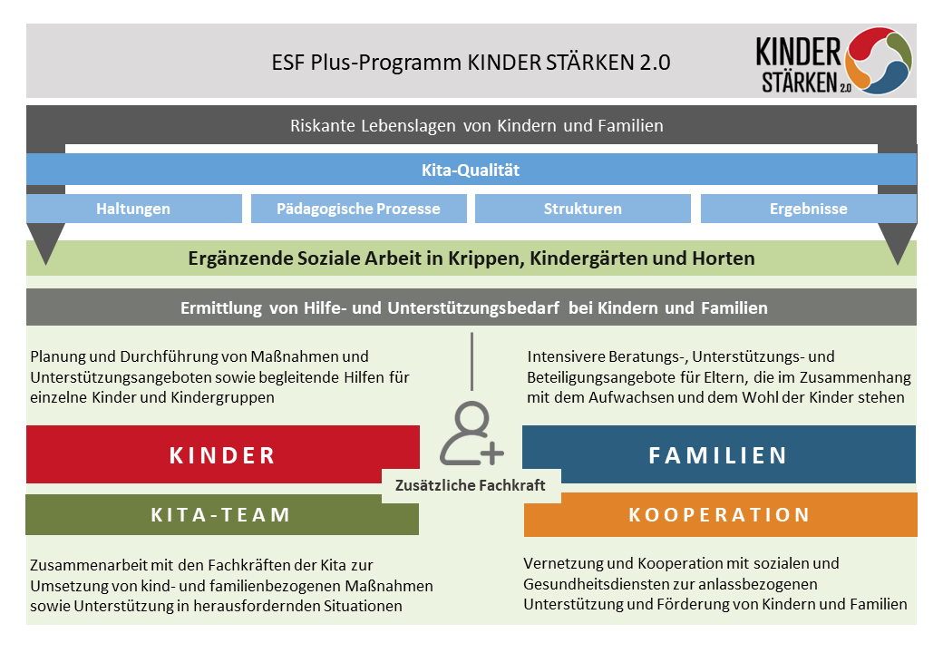 Das ESF Plus-Programm KINDER STÄRKEN 2.0 – Vorhaben für Kinder mit besonderen Lern- und Lebenserschwernissen unterstützt mit pädagogischen Angeboten von zusätzlichen Fachkräften in sächsischen Kindertageseinrichtungen Kinder und deren Familien in besonders herausfordernden Lebenssituationen. In den beteiligten Kinderkrippen, Kindergärten und Horten ist jeweils eine zusätzliche Programmfachkraft tätig.
